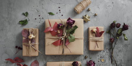 Lots of wrapping paper contains plastic. Opt for the understated elegance of brown parcel paper tied up with string – adding natural decorations like dried flowers or homemade cookies. Don’t forget that tape cannot be recycled. Find creative ways to ensure tape isn’t used.